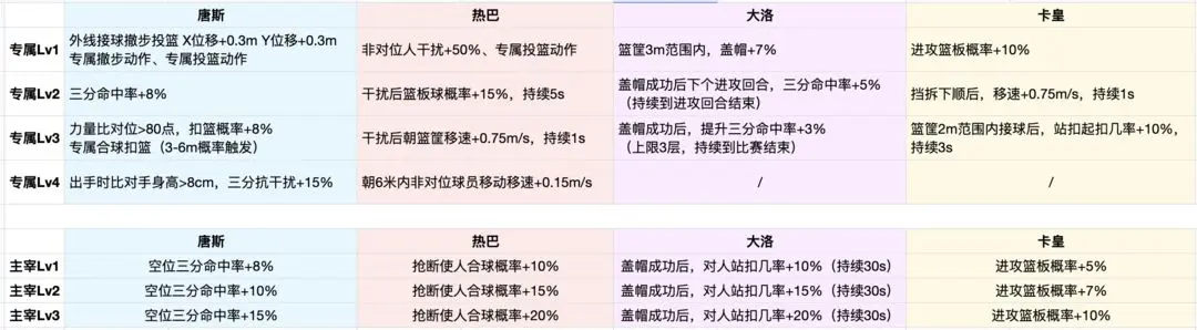 ①专属技能效果包括:增强上篮与扣篮过程中的抗盖帽及抗干扰表现;加快运用专属运球动作进行突破时的速度;提高使用专属投篮动作时的中投属性数值;强化突破过程中的力量与脚踝能力。