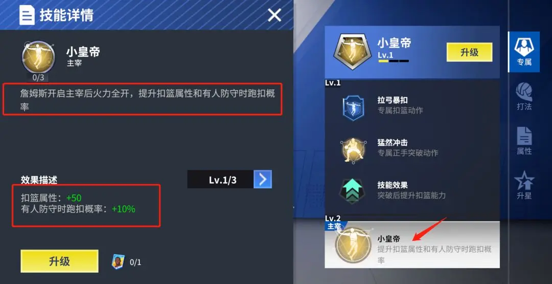 ○打法特点:新秀詹姆斯升至3星后将解锁主宰技能,能进一步增强扣篮属性以及有人防守情况下的扣篮概率;不仅如此,3星的新秀詹姆斯还会解锁篮下金刚技能,在篮下区域也具备更高的强起扣篮几率。