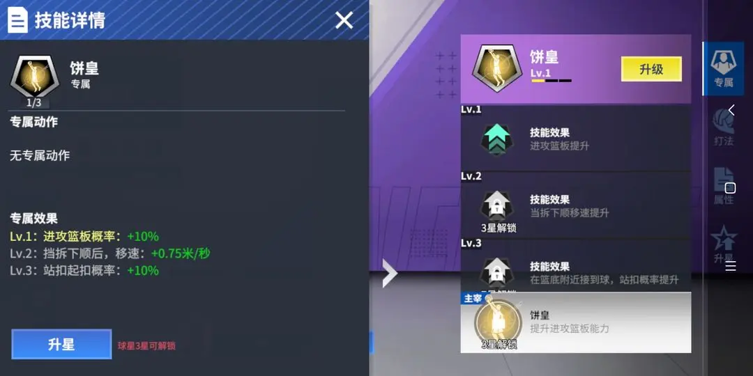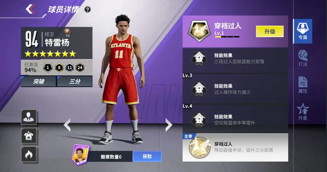 ①专属技能:在使用专属动作后,可提升脚踝能力与投篮能力,并减少体力消耗