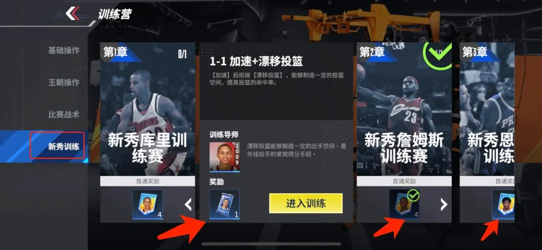 已经选定开局初始球员的“巨星”玩家,若还想体验其他新秀巨星,可前往【训练营】-【新秀训练】板块,完成指定新秀的训练赛即可获取对应的新秀巨星!青涩新星,直接收入囊中!