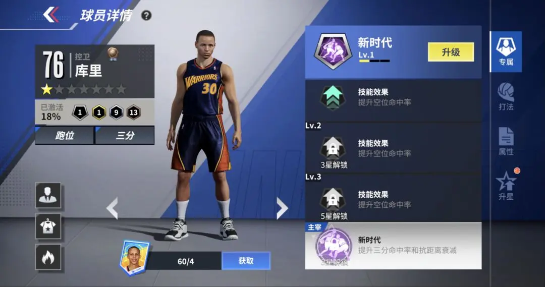 ○打法特色:新秀库里的星级提升至3星时,将解锁其专属主宰技能“新时代”。该技能开启后,不仅能提高远距离三分球的命中率,还会让他掌握后卫常用的实用后撤步投篮动作。