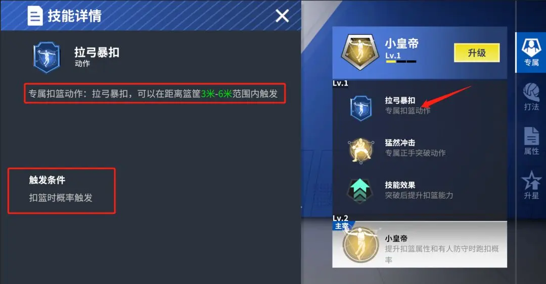 ①专属技能:提高突破后扣篮概率和抗盖帽概率;