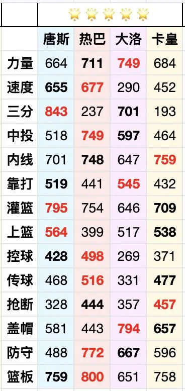 综合来看,热巴在多项数据上表现突出,尤其是关键的篮板数据,唐斯和大洛紧随其后,卡皇则排名垫底。