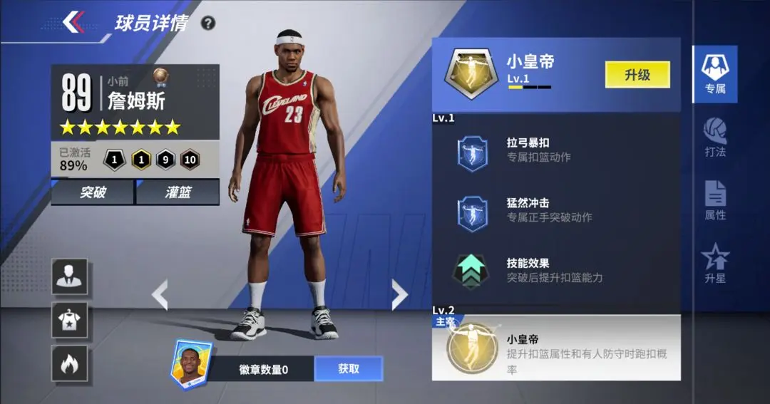 ○实战操作方面:达到5星的詹姆斯会解锁空中接力、补扣等更多动作,同时还能解锁更多盖帽动作与技能,从而进一步增强他的防守能力