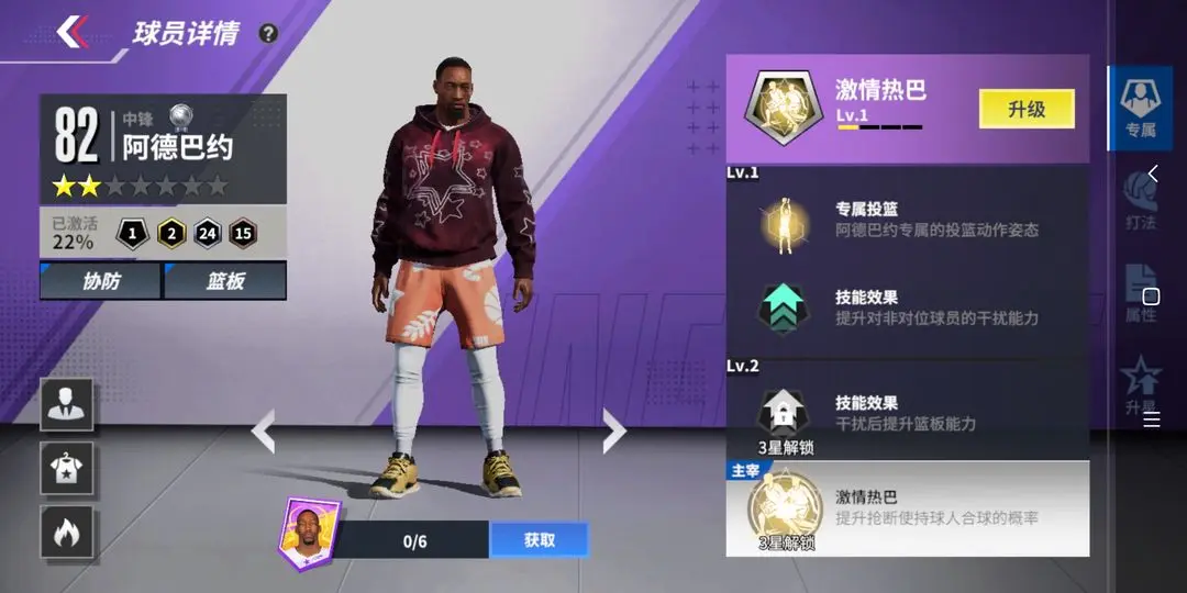 ①专属技能:增强跳步后的力量脚踝能力与扣篮能力,并提升其他相关属性