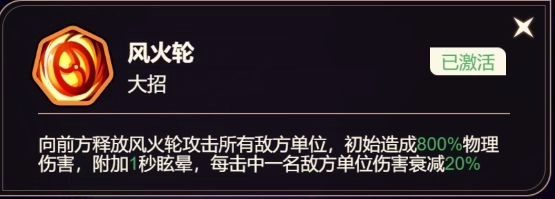 向前方投射风火轮对所有敌方单位发起攻击,初始可造成800%的物理伤害,并附带1秒眩晕效果,且每命中一名敌方单位,后续伤害就会衰减20%。