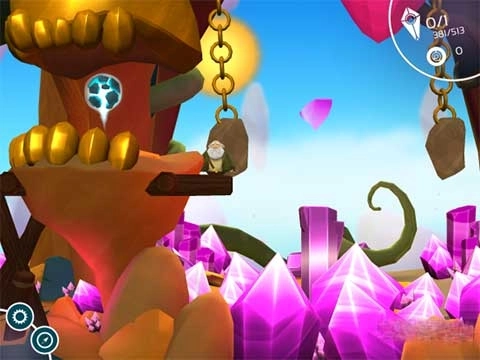 得到一个新的魔法面具后,老爷爷能学会另一项魔法技能——旋转屏幕。这项技能的作用是让游戏画面里所有能移动的物体随着屏幕的倾斜而改变位置。具体的操作步骤是:用右手的两根手指同时点击屏幕右侧,按住手指不松开的同时滑动手指,就能让屏幕倾斜旋转了。像下面图里展示的难点八那样,玩家可以通过旋转屏幕让巨石滚落,清除掉前进路上的阻碍,然后跳上平台就可以了。