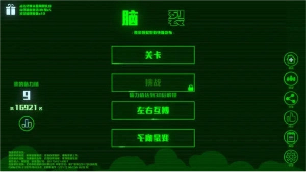 脑裂是UncleCiba独自开发的一款益智反应类休闲游戏。开发这款游戏纯粹是源于作者对游戏的热爱,因此没有专业团队负责画面美化或严格的测试环节。它虐心又烧脑,玩起来既考验手速又挑战眼力,堪称史上最难的反应类游戏,能锻炼你的左右手协调能力。游戏包含各种趣味关卡,旨在突破你的脑力极限。其中的疯狂模式更是会让你大脑“宕机”!要是一个人玩不过去怎么办?那就拉上妹子一起吧!就算游戏没通关,说不定还能有意外收获呢!