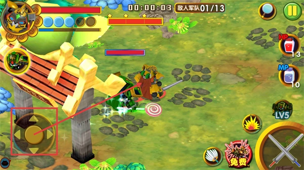 2、在战斗界面中,通过左侧的方向控件来操控角色,同时留意敌人军队的进度(当前为01/13),并根据右侧显示的HP-13与MP-10道具补给状态,适时发动技能对敌人展开攻击。