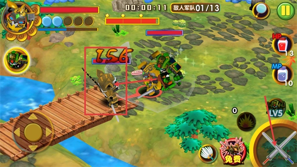 战斗时留意显示为-156的伤害数值,持续通过方向控件调整角色站位,点击右侧的攻击按钮来打出伤害,以此推进敌人军队01/13的击败进度。