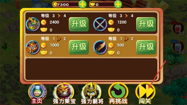 4、战斗结束后会进入升级界面,你可以消耗对应的货币来给角色和装备升级,完成升级操作后点击闯关按钮就能继续挑战,通过这样的方式积累资源,提升自身的战力。