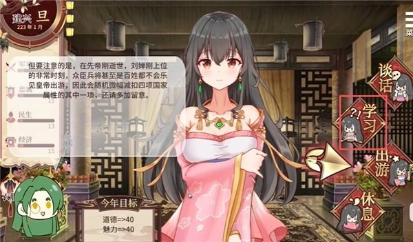 《刘禅育成计划》是一款以三国时期蜀汉为背景的君主养成策略游戏,核心特色在于打破传统叙事框架的反套路剧情、多维度的角色培养系统以及高自由度的剧情分支选择,既保留了历史改编题材的趣味性,又具备策略玩法的深度。游戏以历史上被称为“扶不起的阿斗”的刘禅为主角,玩家将以导师或诸葛亮的身份,从刘备白帝城托孤这一关键节点开始,全程参与刘禅的成长过程——通过不同的决策与培养方向,不仅能将其塑造为励精图治的明君、开疆拓土的霸主,还能触发如女帝线等充满想象力的特殊结局。