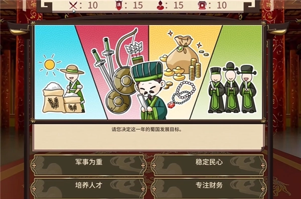 2、刘禅对玩家建议的采纳率会随着好感度动态调整,玩家需要同时兼顾君臣关系的维护与国家发展的需求。