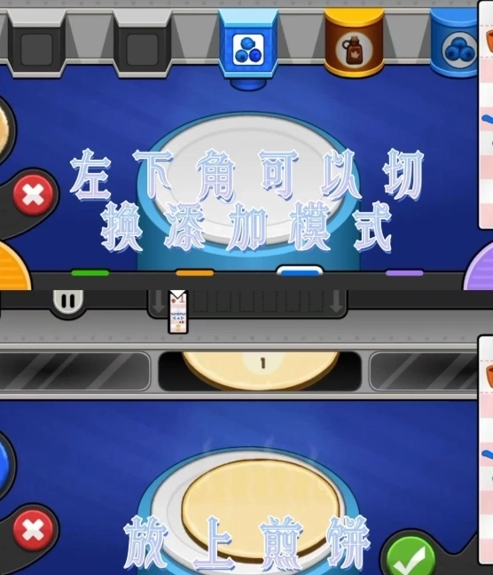 2、点击屏幕左下角对应的按钮,把面糊拖到烤盘上开始煎饼,要留意火候,等煎饼右侧的能量条到一半时,点击煎饼翻面,两面都煎好后,按住煎饼拖到右边订单下方的盘子里。
