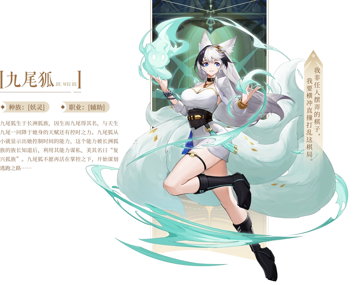 九尾狐出身于长洲狐族,因生来便有九条尾巴而得名,伴随这天生九尾一同降临的,还有她操控时间的天赋。自小便已显露控时能力的她,这一特殊天赋被狐族族长知晓后,对方便以“复兴狐族”为幌子,利用她的能力谋取私利。不愿再受他人掌控的九尾狐,就此开始暗中筹划逃离的道路……
