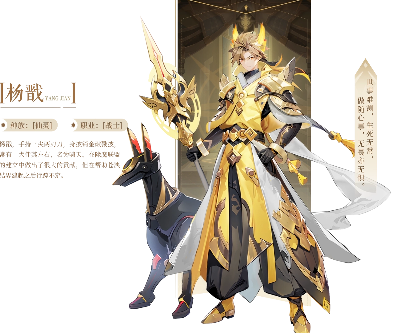 杨戬,手中握着三尖两刃刀,身上披着销金袍,身边常跟着一条名为啸天的神犬。他在除魔联盟的创立过程中立下了汗马功劳,不过在协助建成苍泱结界后,便没了固定行踪。