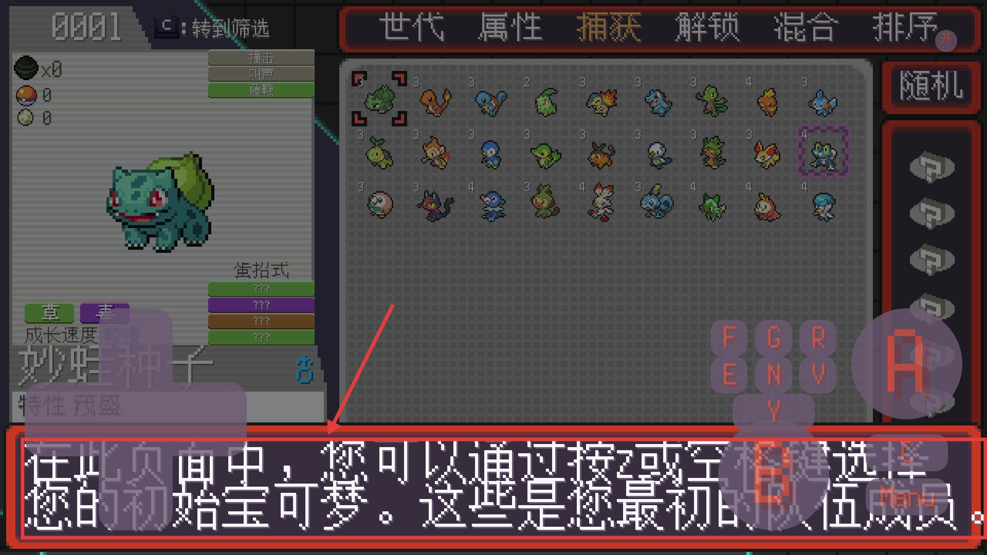 2、在宝可梦选择界面按【Z】或空格选定初始宝可梦,用10个指数点优化初始队伍配置。