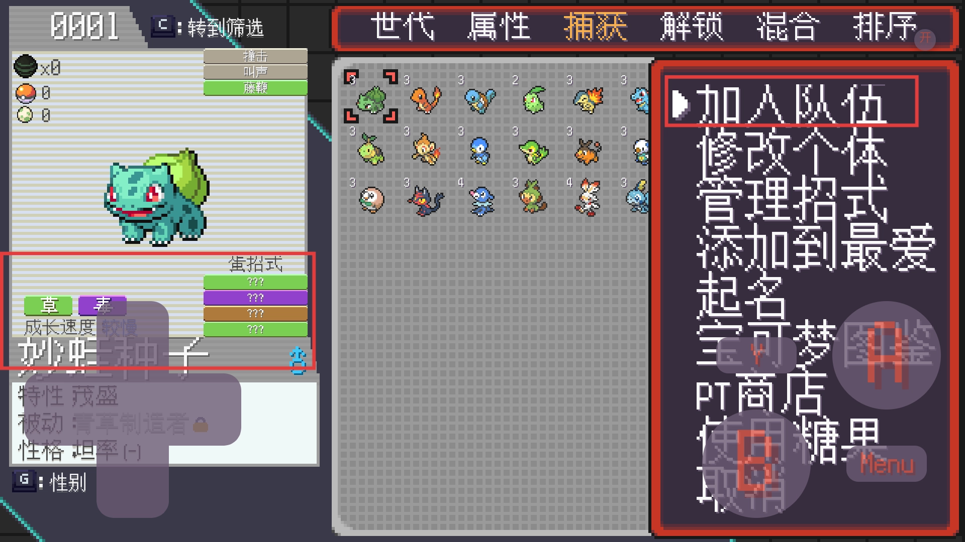 1、启程时从三个初始宝可梦选定伙伴,确定后入主界面,后续抓或扭蛋机补新成员壮大队伍。