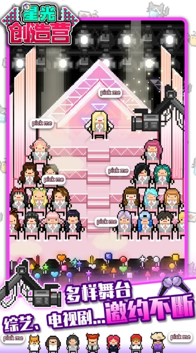 星光创造营是一款像素风格的偶像模拟游戏,你要经营属于自己的明星公司,培养出优秀的偶像团体。在星光创造营里,你可以Pick自己最喜欢的小哥哥小姐姐,助力他们成长为宇宙第一的偶像天团!