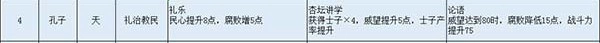 技能3(论语):当威望数值达到80时,腐败值将减少15点,同时战斗力会提高75点。