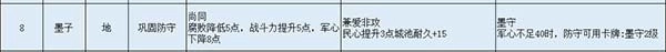 技能3(墨守):当军心数值低于40时,进行防守操作时可使用的卡牌为:墨守2级。