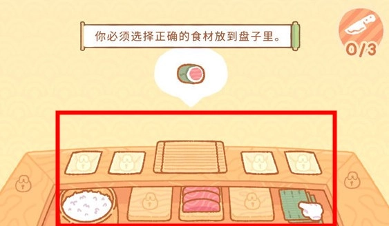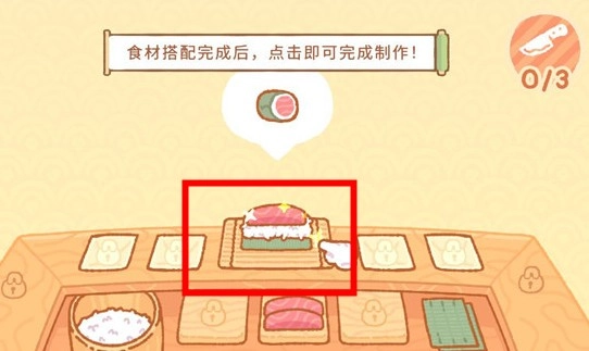 点击屏幕完成寿司的组合,同时要保证所有食材的搭配都符合要求。