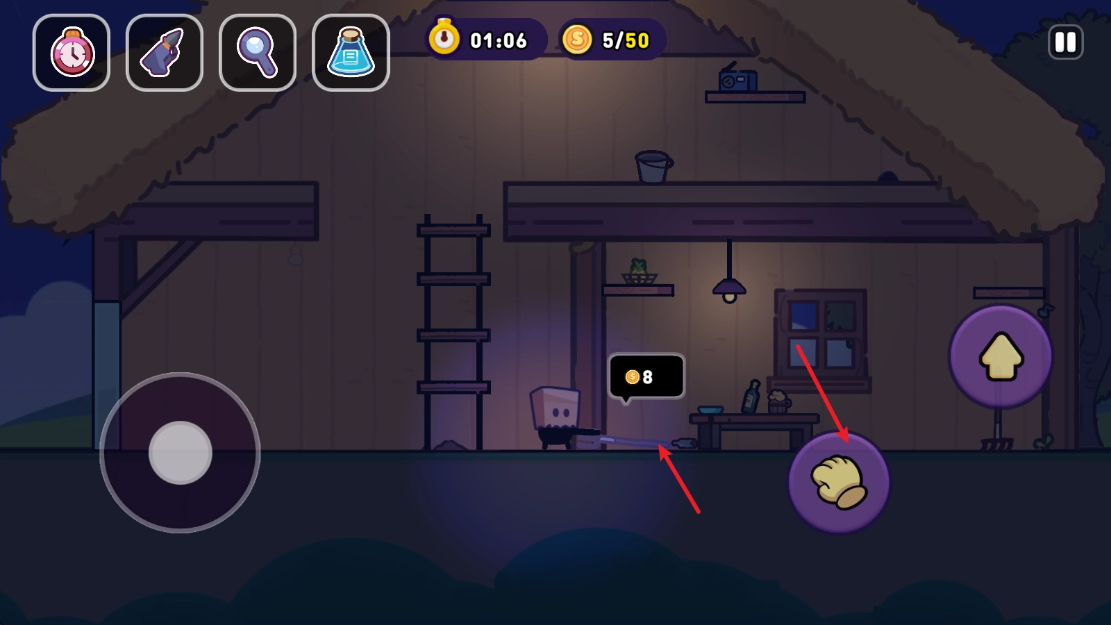 《盗贼之夜》呈现了一款趣味十足的休闲盗贼闯关游戏。游戏背景设定在一个遍布未知与危险的环境里,玩家将化身一名籍籍无名的盗贼,于暗夜之中悄然潜行,任务是潜入各个地点,窃取物品后顺利脱身。