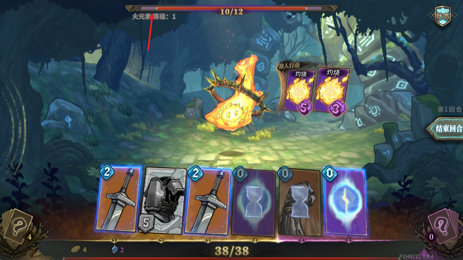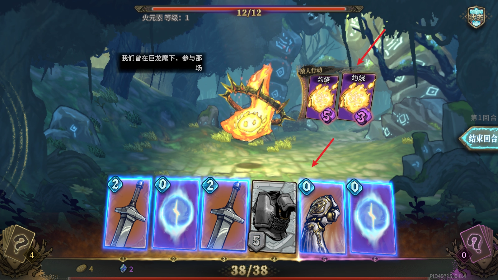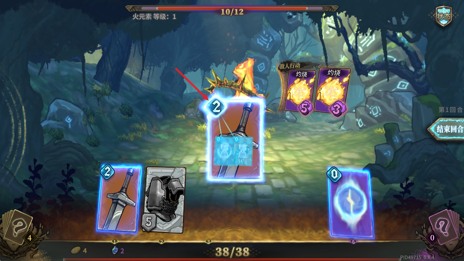4、部分卡牌的使用需要消耗费用,这个费用就是卡牌左上角标注的数字,比如这里的剑卡牌,就需要消耗右侧的两张卡牌才能使用。