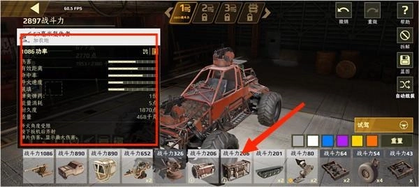 玩家在改装界面对自己的战车进行改装时,左上角会显示所选配件的相关数值,界面下方则列出了当前可用的配件及其对应的战斗力数值。玩家需要通过对这些配件进行合理搭配,来打造出属于自己的最强战车。