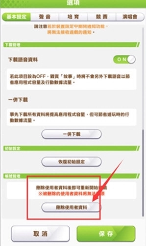 3、选项下滑至底部删除使用者资料即可重置账号数据