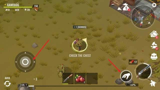 1、进入游戏后,通过左侧的摇杆进行移动,靠近物品后点击右侧的小手即可采集资源。