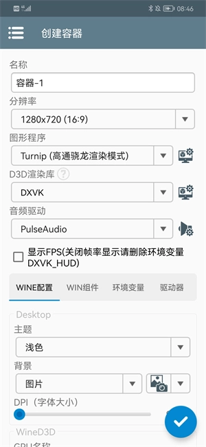 安装结束后,点击界面右上角的加号按钮来创建容器,接着依据自身手机的配置情况对各项参数属性进行调整。