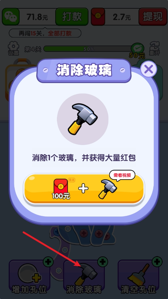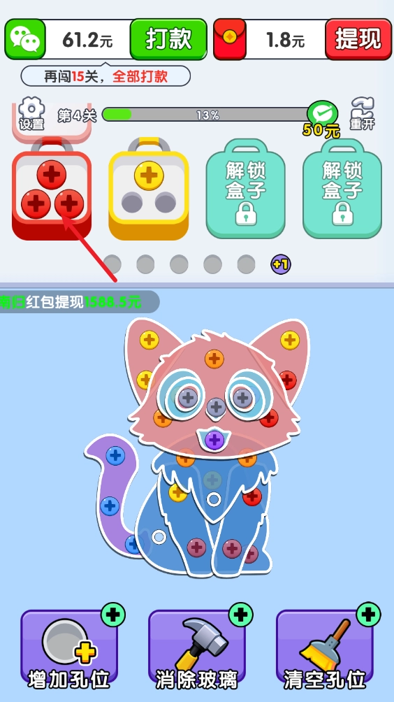 成功消除所有的螺丝就可以过关获得奖励了。
