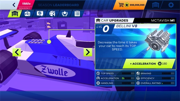 在挑选比赛类型的界面,点击右上角齿轮图标旁边的车库入口,就能对赛车进行改装;通过升级各类配件,还能进一步提升赛车的性能表现。