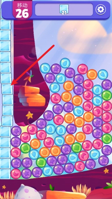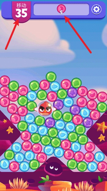 在界面最上方,我们能清楚看到需要收集的泡泡类型和对应的数量,而在它的旁边,标注着本次关卡所规定的步数限制。