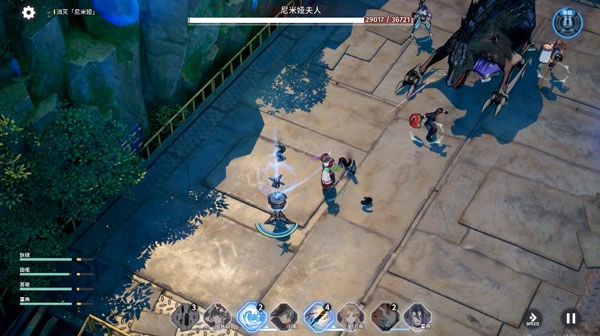 在一场boss战里,boss会轮换使用多种技能攻击玩家,包括扇形技能、召唤小怪的技能,偶尔还会暂时退出战斗,到场地边缘释放范围技能攻击玩家小队;而依据角色定位的差异,有的角色要在boss身前扛伤害、拉仇恨,有的是在侧面输出的近战职业,还有在后方的辅助和远程输出角色,玩家总共能携带四名角色参与战斗。
