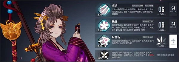技能层面,一技能“燕返”会锁定范围内血量百分比最高的敌人造成高额伤害,同时额外选取三个目标进行攻击。需要注意的是,后续每多选取一个单位,该技能的伤害就会降低20%,不过即便有此衰减,依托技能本身的强度,实际输出依然相当可观。再搭配二技能带来的自身伤害提升与暴击率加成,结合居合斩的大范围群体伤害效果,能让后续的输出能力进一步增强。