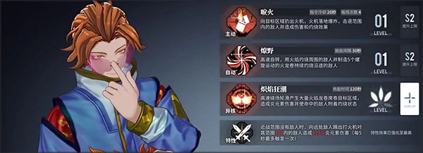 技能方面,其一技能为范围性火属性伤害,同时附带持续五秒的灼伤效果;二技能是以自身为中心、一定半径范围内的攻击,对最多五名敌人造成高额火属性伤害,还会生成五个火龙卷,对经过路径上的敌人再次造成火属性伤害;大招则是大范围、高伤害的火属性攻击,附带十秒灼伤状态。需要注意的是,当敌人被该角色的大招施加灼伤后,若再次受到火属性伤害,其承受的暴击伤害会相应提高。