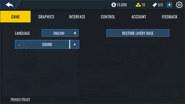 2. 在这里,玩家可以轻松调整游戏语言,不管你习惯使用中文、英文还是其他语种,都能自由切换;画质也能根据需求调节,是追求极致的画面质感还是保证流畅运行,全凭你选择;音效方面同样如此,激昂的引擎轰鸣声、动感的背景音乐,都可以调到最让你满意的音量。