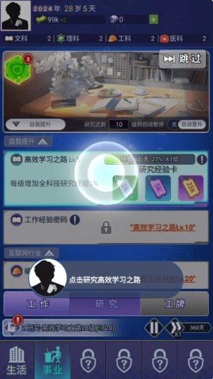3、点击需要研究的项目后,系统会自动为你完成升级操作并获取资金。