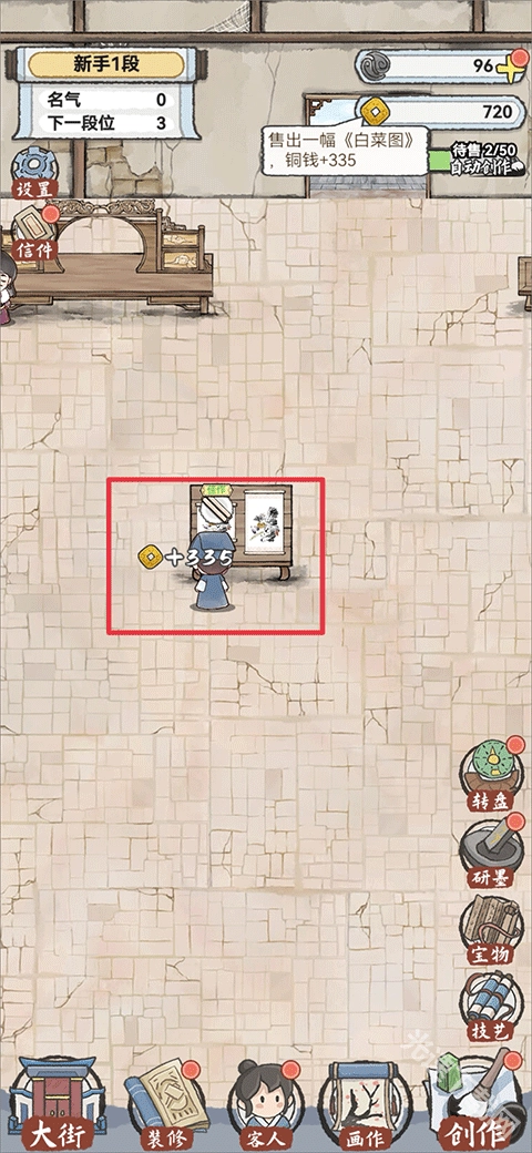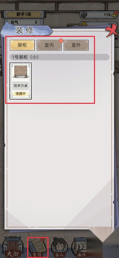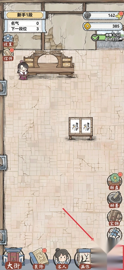 5、画作装裱完成后就可以进行出售啦,出售需要桌子来摆放画作,点击下方菜单栏中的装修可以购买桌子;