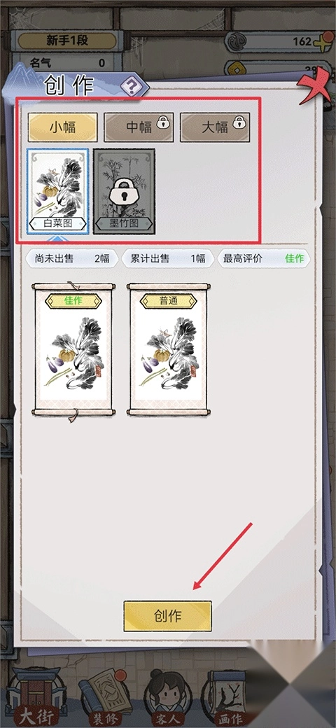 1、双击打开水墨记游戏,你将需要经营一家画室,而经营画室首先需要创作画作,点击右下角创作画作;