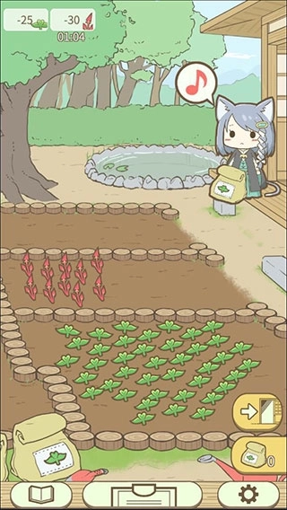 5、户外便是我们的药圃,这里栽种着各种各样的药草,它们如同农场作物一般会按时生长,得手动进行采集,我们也能借助道具让右上角的小猫来帮忙打理。
