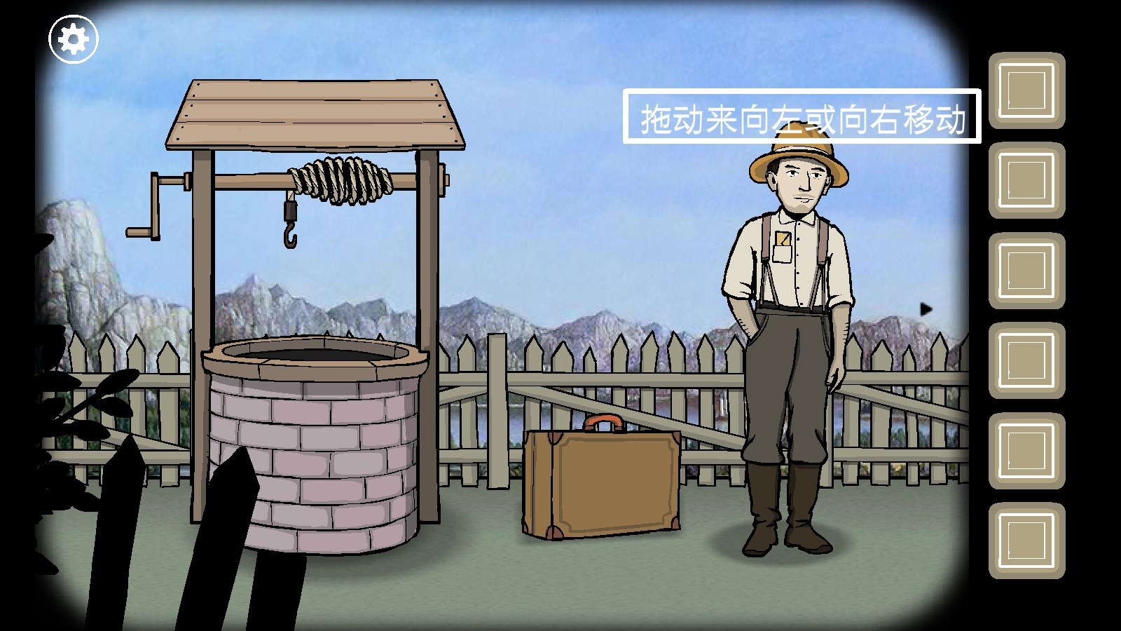 1、进入关卡后,先大致观察了一下周围环境,看到场景里有一口水井、一只小狗、一个洒水壶和一个行李箱。出于人类的好奇心,我先点击了行李箱,结果发现它配有一个三位数字的密码锁。