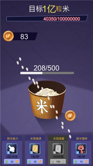 1游戏玩法为“数米”,开局时,目标就醒目地置于屏幕正上方,即数满1亿粒米。在数米进程里,随着米粒数量增多,系统会适时提供一些小道具,助力玩家完成任务。