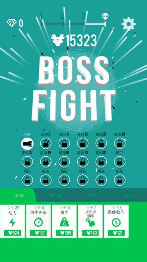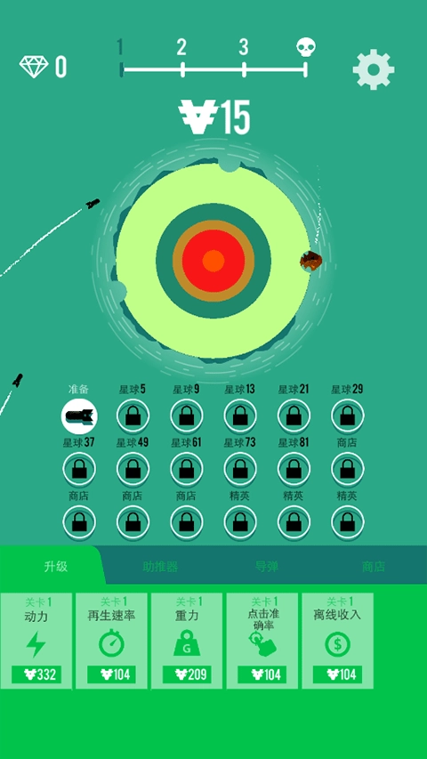 轰炸星球时可以获取金币,用来升级动力、再生速率、重力等属性。