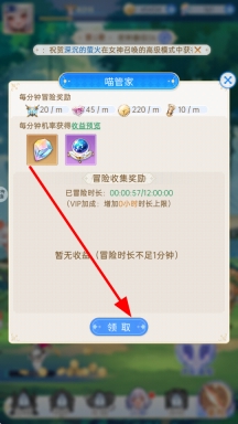 3、在喵管家界面,可查看冒险时长以及与之对应的物品奖励。若满足领取条件,点击“领取”按钮,即可获取相应的冒险奖励收益。