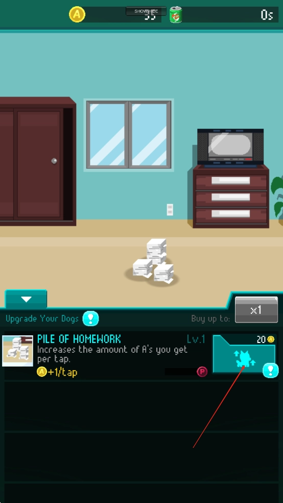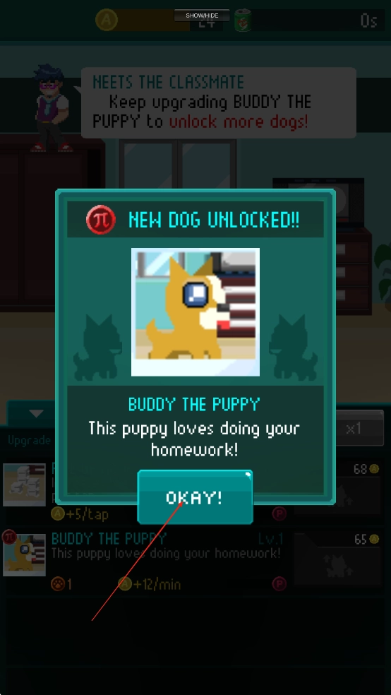 进入游戏界面后,找到书桌前的学习区域并点击,持续点击该区域就能收集金币。当金币攒够系统要求的数量时,就能解锁第一只宠物犬,同时激活自动学习的功能模式。