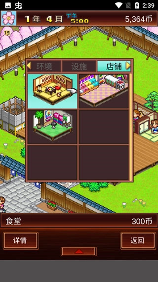 点击店铺,可以建造食堂、游艺机、小卖铺等等