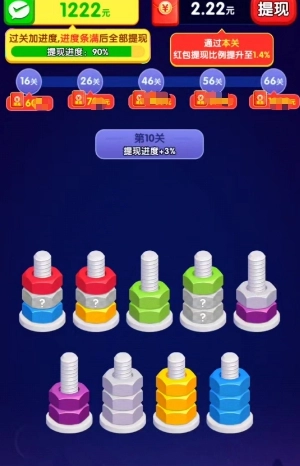 这是一款结合了休闲与益智元素的闯关游戏,核心玩法围绕色彩匹配展开——通过拧下不同颜色的螺丝帽,将相同颜色的进行消除即可过关。游戏操作简单易上手,同时设置了海量关卡供玩家挑战解锁。过程中还会掉落各种红包奖励,让你在轻松解谜的同时收获惊喜福利。无论何时何地,都能开启这场趣味消除之旅,快来体验吧!